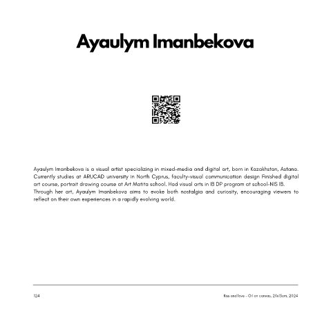Ayaulym Imanbekova is a visual artist specializing in mixed-media and digital art, born in Kazakhstan, Astana.